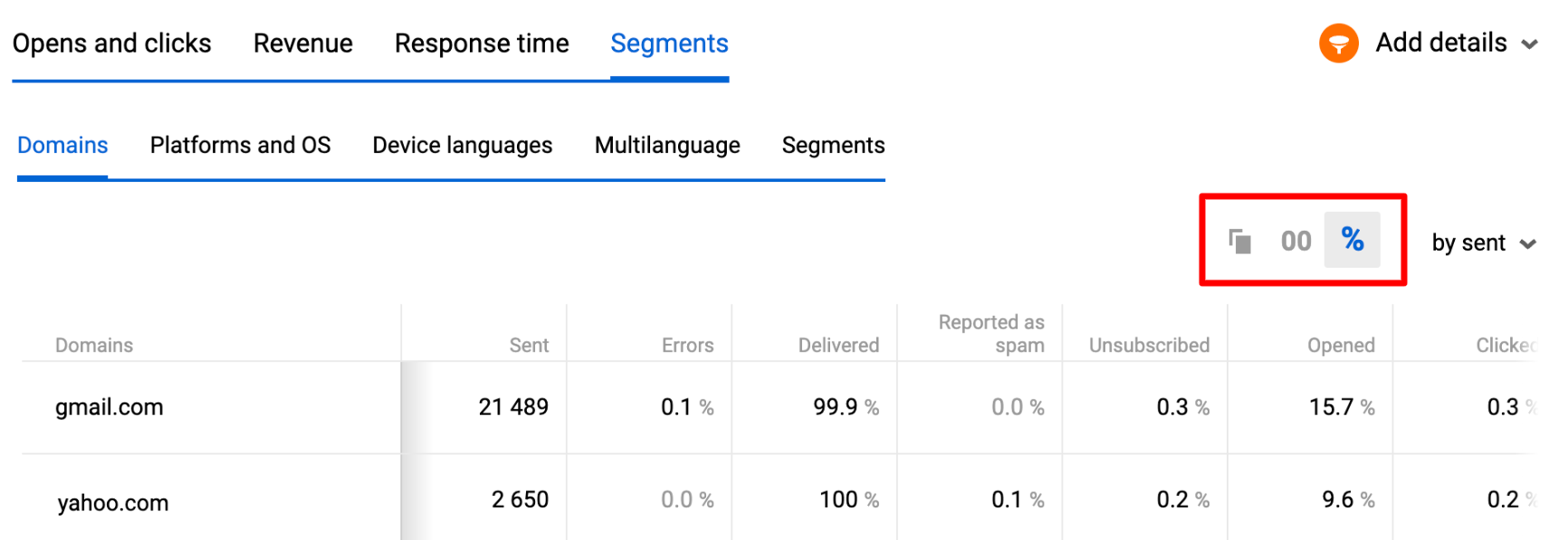If, for some mailers, the opened percentage is significantly different from other domains, and this percentage is much lower than before, we recommend checking the domain's reputation. Also, pay attention to errors. A high rate of errors affects the probability of getting into spam.