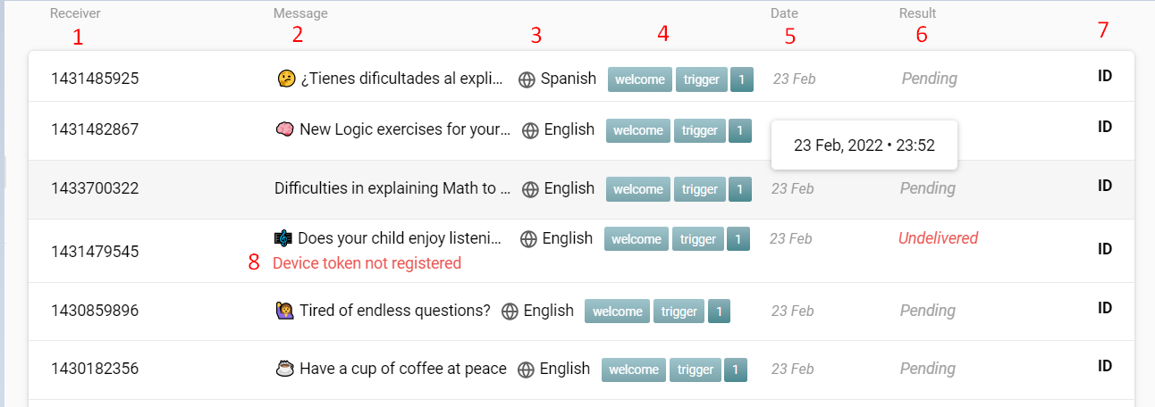- Message ID. To copy an ID, click on the copy icon next to it. Click on the link icon to edit a message.
