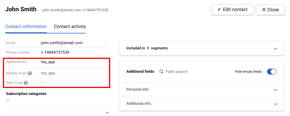 Install the SDK to display contacts' mobile device information. When a contact installs your mobile app, SDK collects data about the contact’s mobile devices connected to the app.