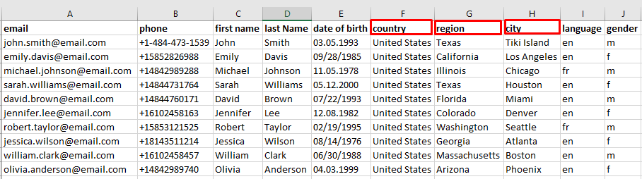 NoteIn the imported file, you must divide the contact's address into columns: address, country, city, region and postcode separately.