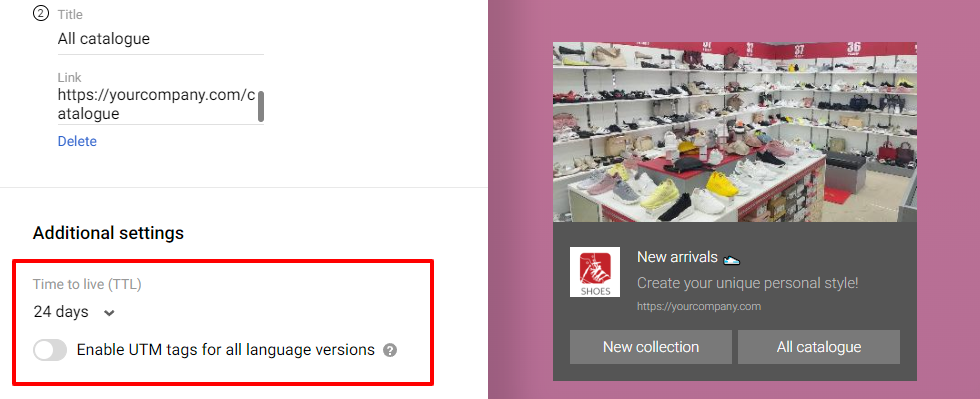 - Time to Live (TTL). TTL — the period after which the message will not be displayed if it has not been delivered by this time. By default, it’s 1 day, but you can select other options.