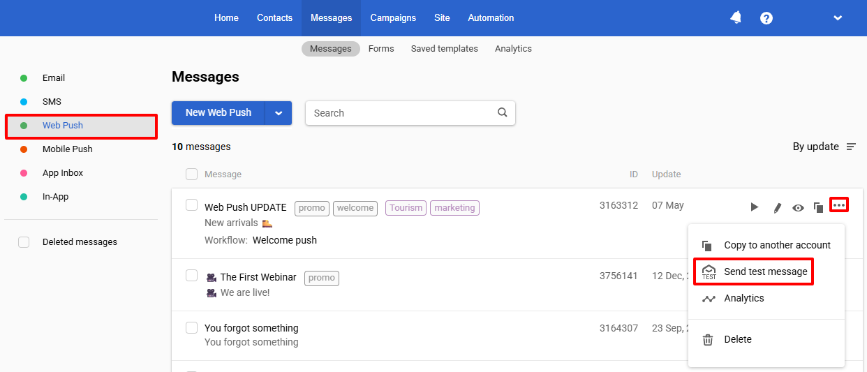 - From the message list — open the menu with three dots to the right of the message name and select Send test message.