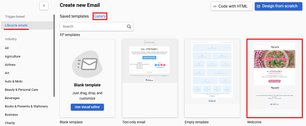 - Open the Gallery tab and select an email template from Lifecycle Emails:
