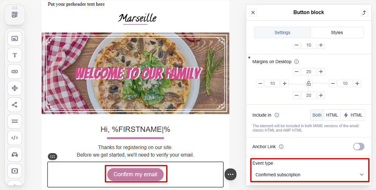 The subscriber confirms their address by clicking the corresponding button in the confirmation email. This button is assigned to the Confirmed subscription event type.