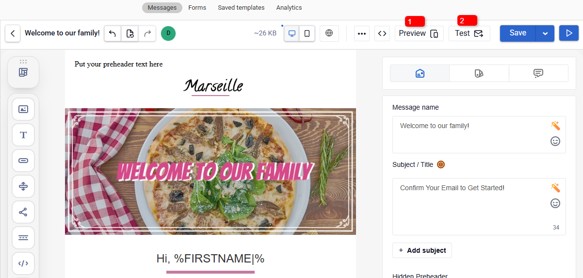 - To send test emails, click Test (2). To preview ready emails on desktop and mobile, click View message (1).