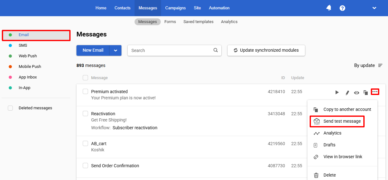 - From the message list — open the menu with three dots to the right of the message name and select Send test message.
