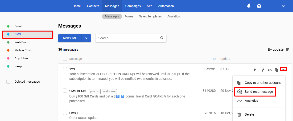 - From the message list — open the menu with three dots to the right of the message name and select Send test message.