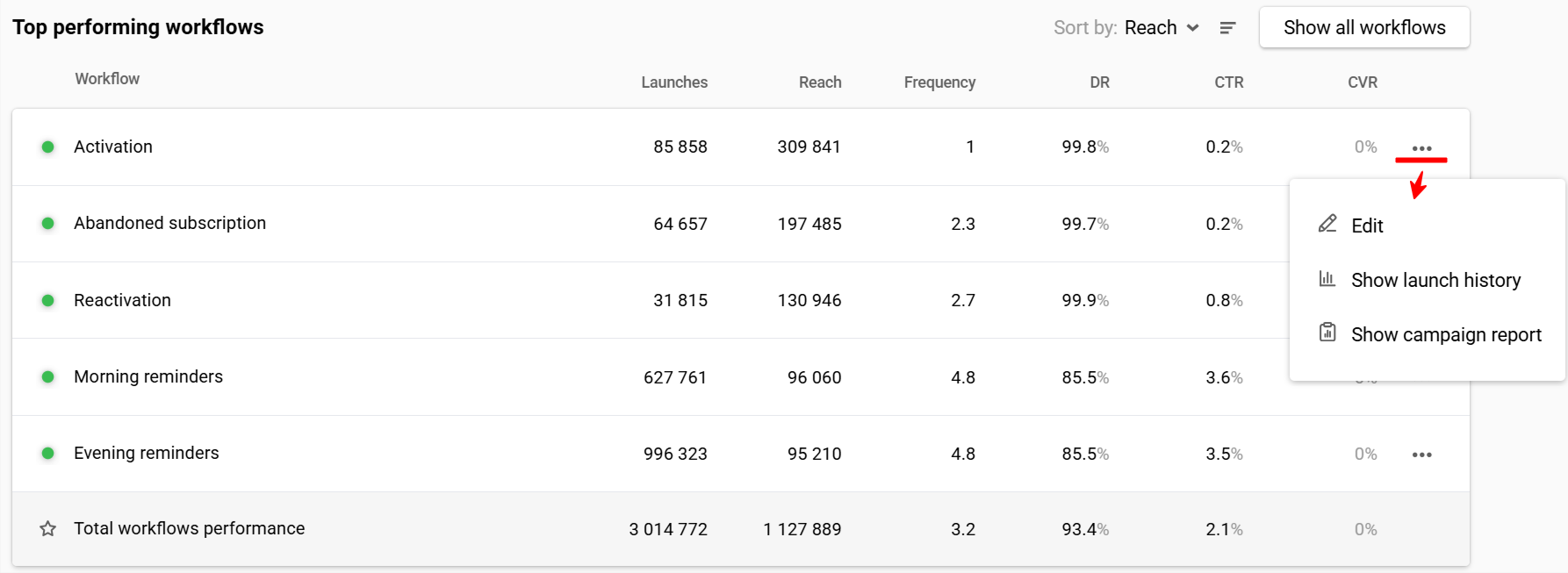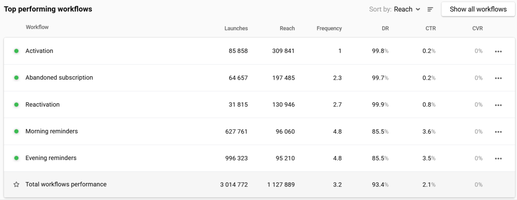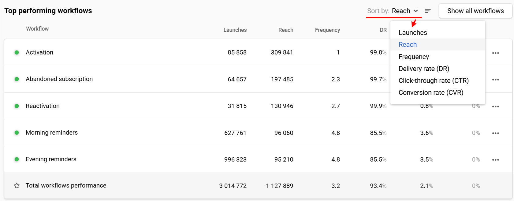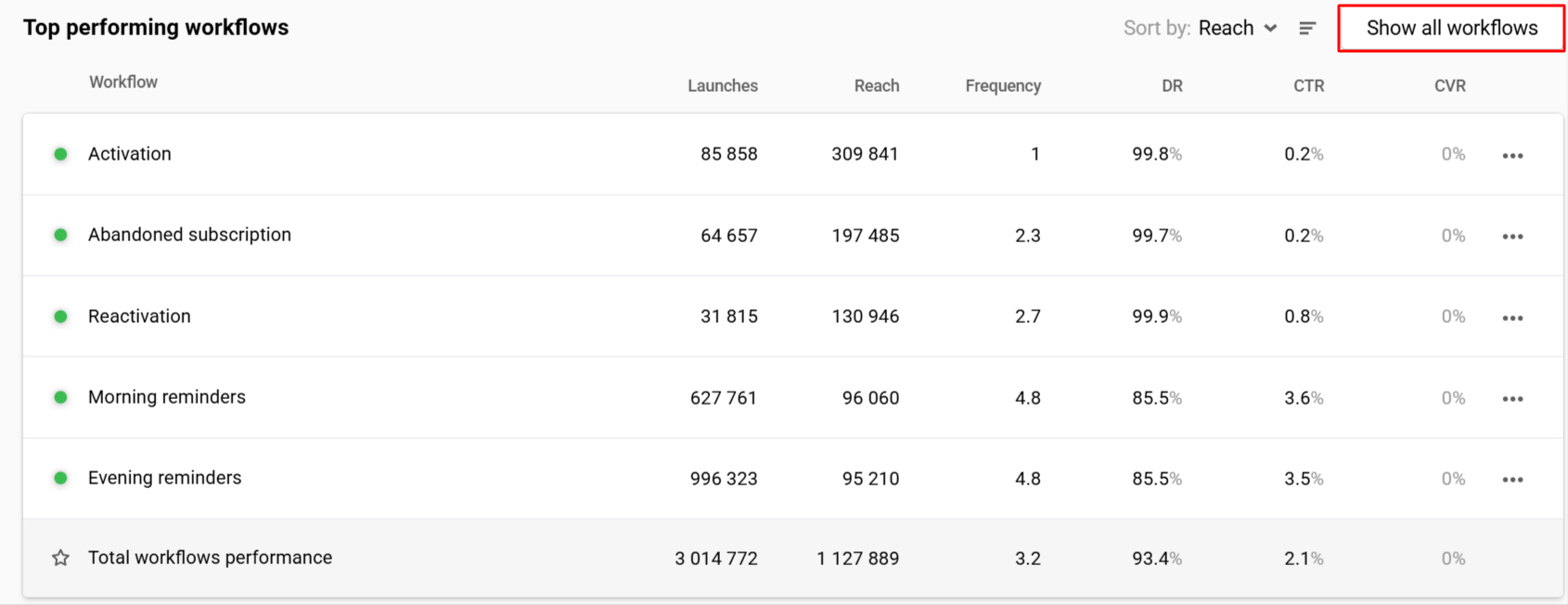 | Frequency | Sent ÷ Reach | Sent ÷ Reach per channel | Sent ÷ Reach per workflow | — |