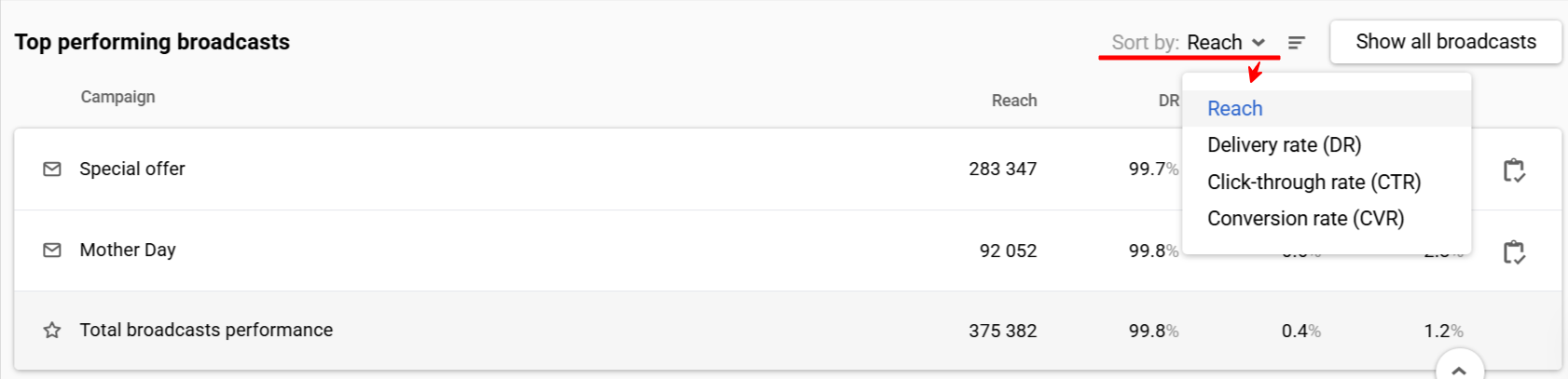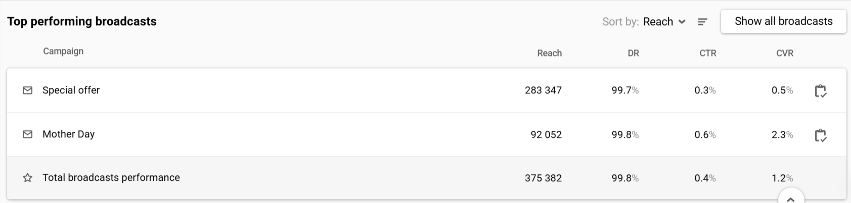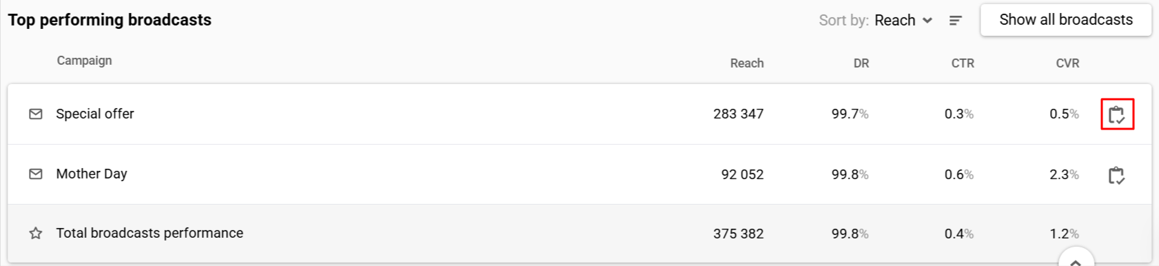 - Show campaign report: Clicking the icon next to the broadcast name navigates to its report.