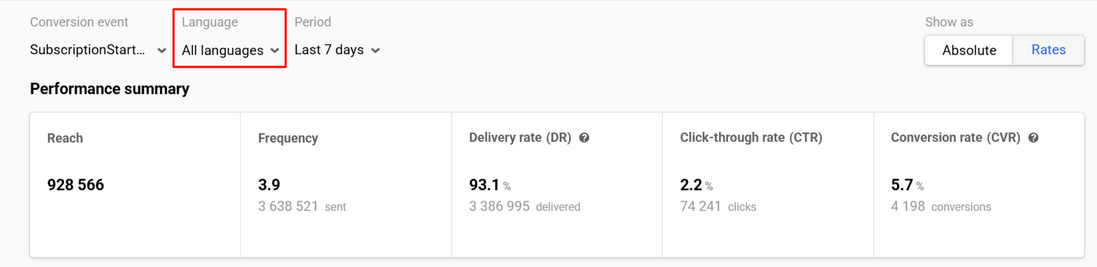 - Language (for accounts with multilanguage): filtering by language versions of messages.