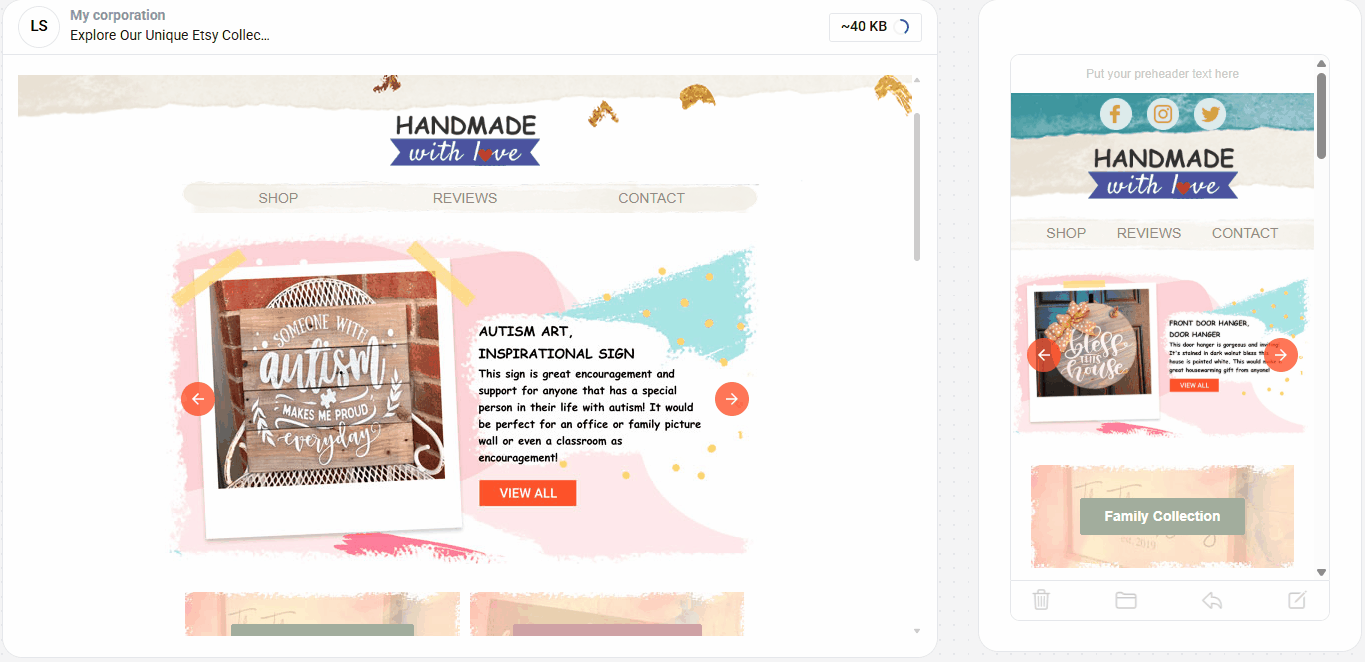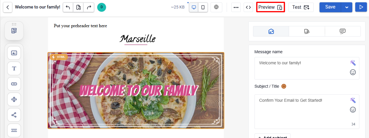 In the editor, you can preview both versions and switch between them with a single click. Click Preview to see how both emails look on different devices.