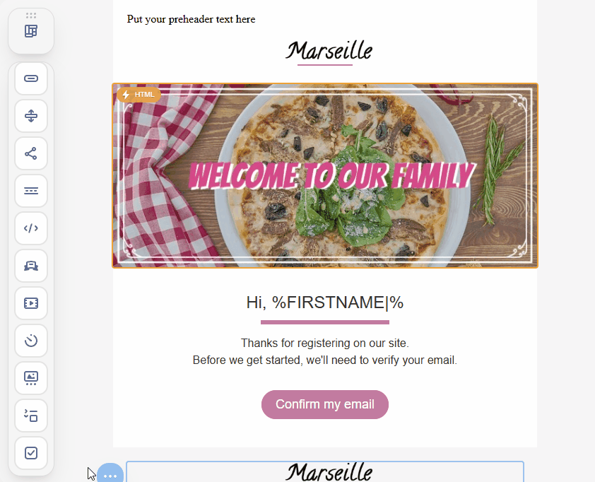 Create an HTML email and add AMP components to it. You can get AMP components from the amp.dev catalogue or use ready-made AMP Blocks and Modules in our editor.