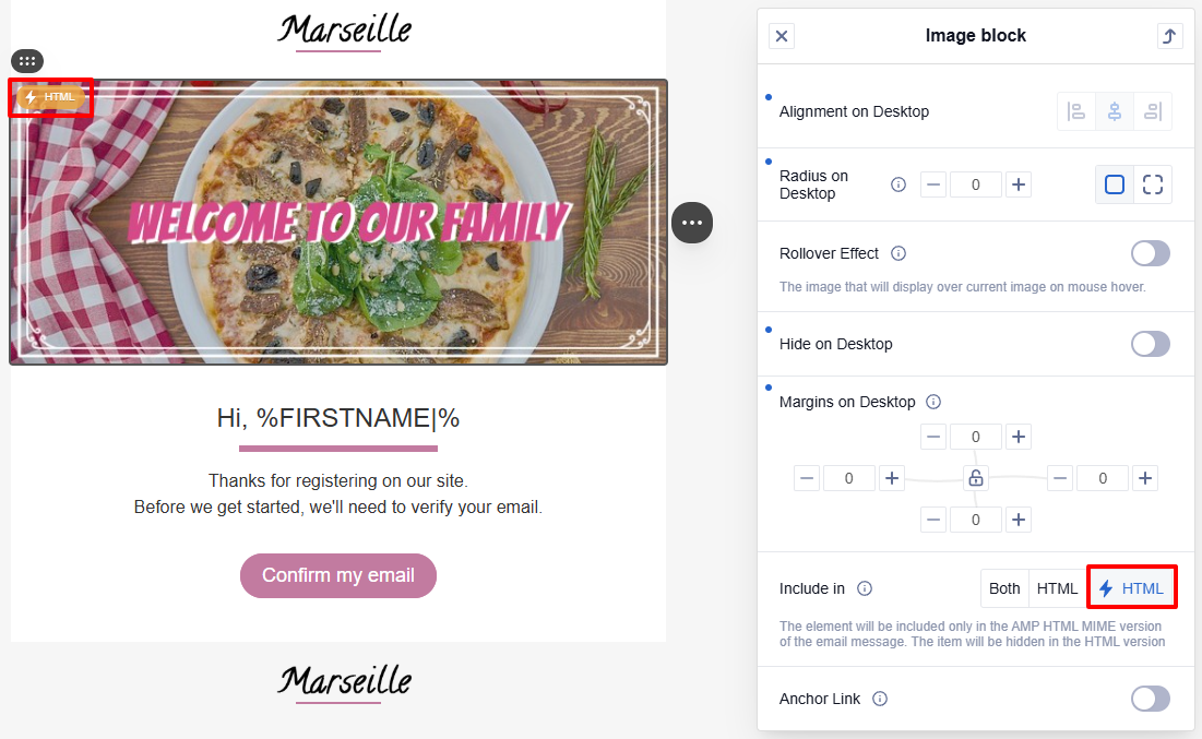 Our platform was one of the first providers (Stripo, Litmus, Amazon Pinpoint) to announce AMP support and incorporate it into the system. When you create an AMP-supported email in the editor, enable AMPHTML for any block that includes an AMP element.