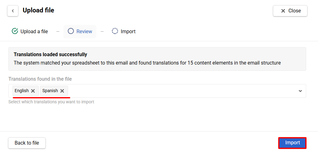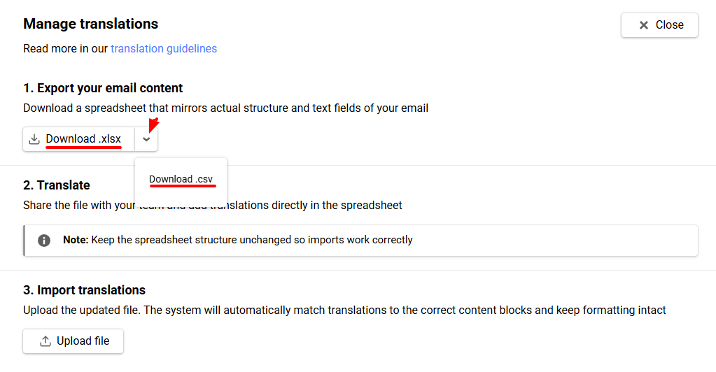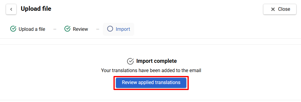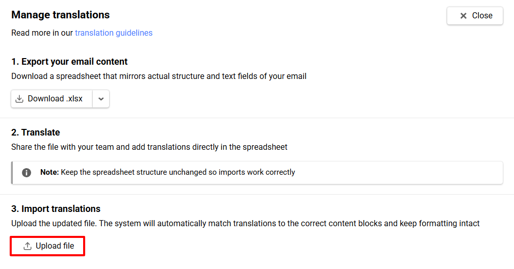 - In the Manage translations window, click Upload file.