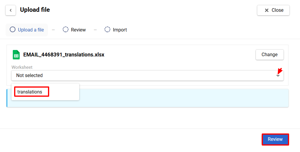 - Select the sheet with translations and click Review.