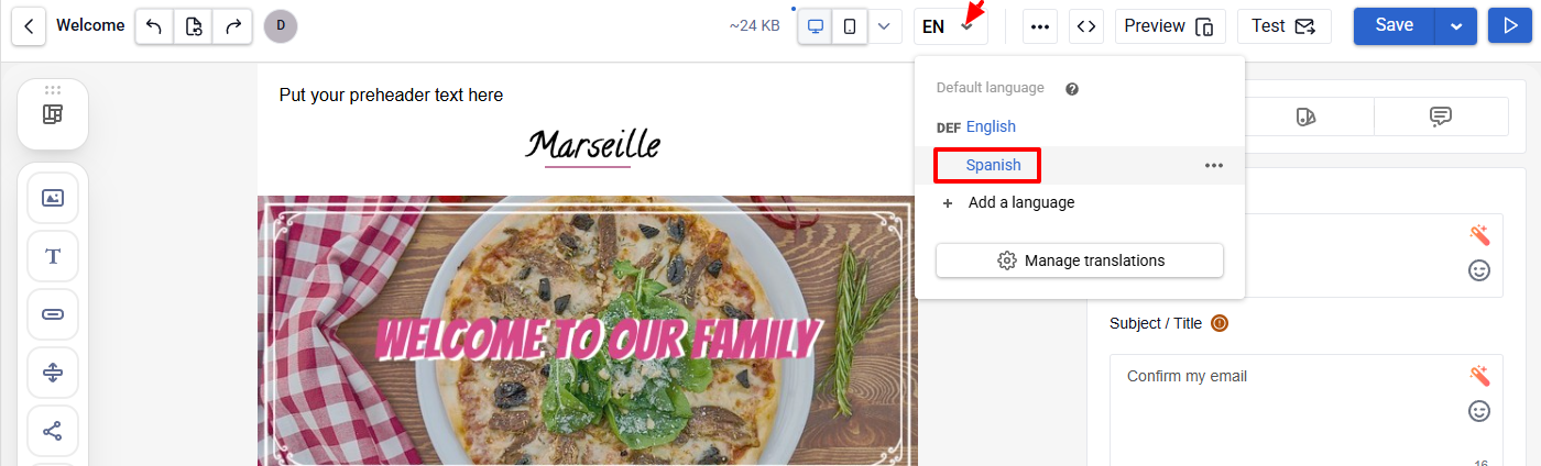 - In the message editor, click the language switcher.