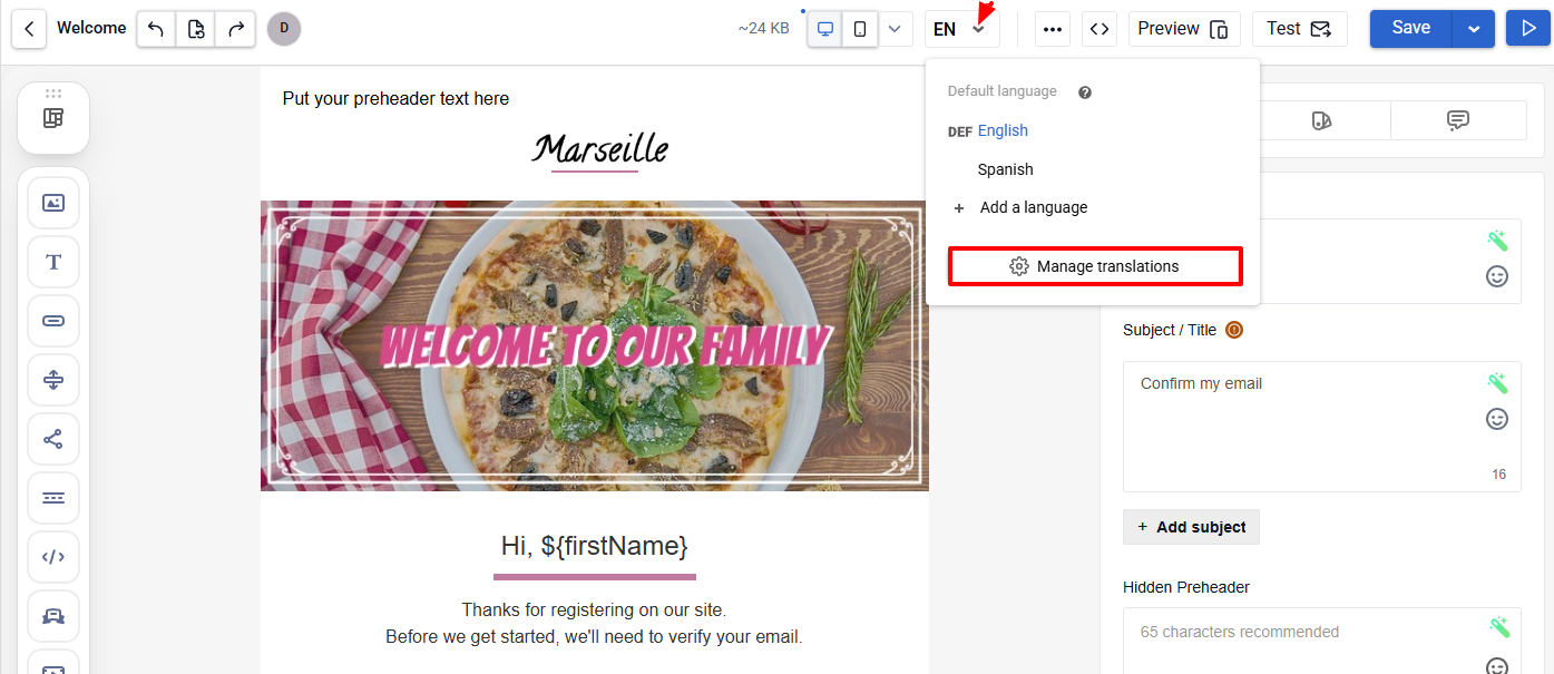 The Manage translations feature lets you work with language versions of email messages outside the editor.