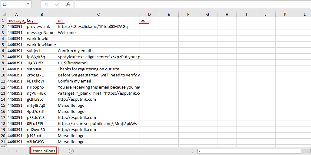 - Enter translations in the corresponding language columns.