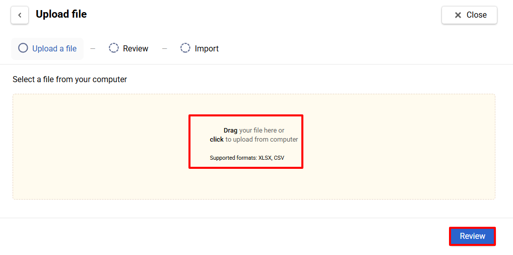 - Drag and drop the file into the upload area or click to select it from your computer.