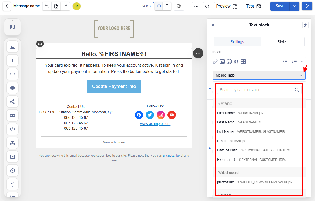 Personalization Menu in Reteno Editors