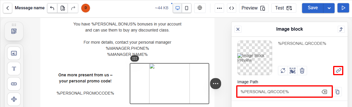 To add a variable for an image, click the Image block → URL and insert the variable (for example, %PERSONAL.QRCODE%) in the Image Path field.
