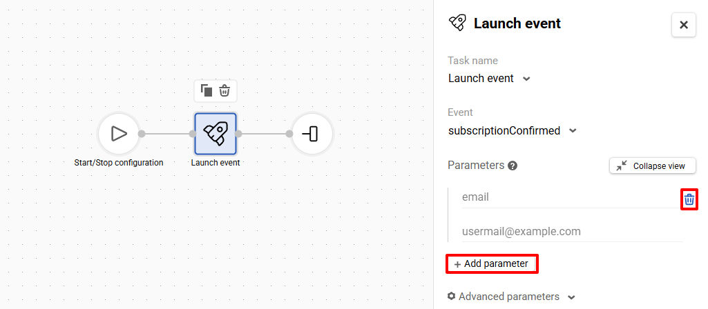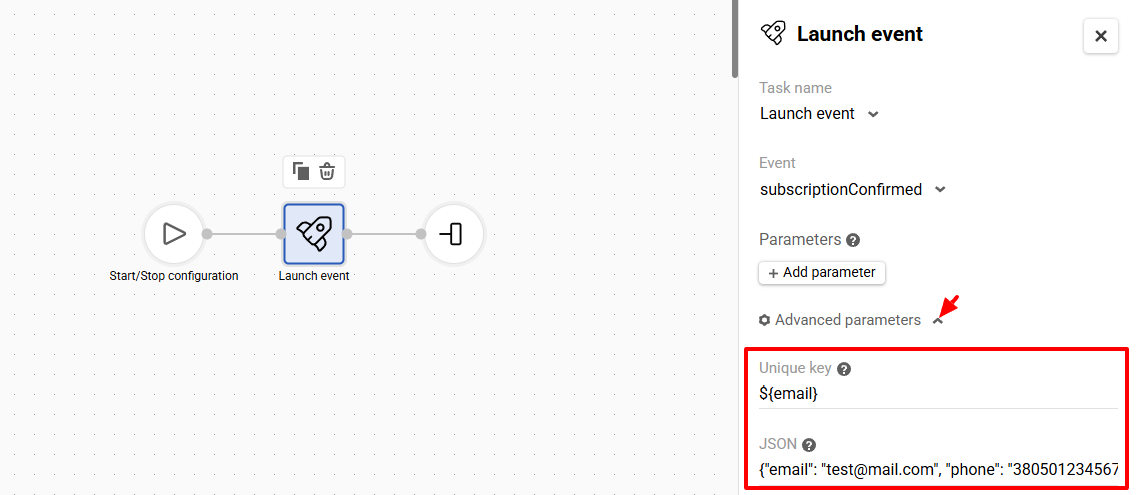 ${phoneNumber}. If you have a different name for the variable in the event, specify it in the field. - JSON: field contains a line or a variable with a line in JSON format with contact data (phone number, name, surname, city, additional fields). Email address is specified by default; if needed, specify other additional data. The parameter confirmed is ignored.