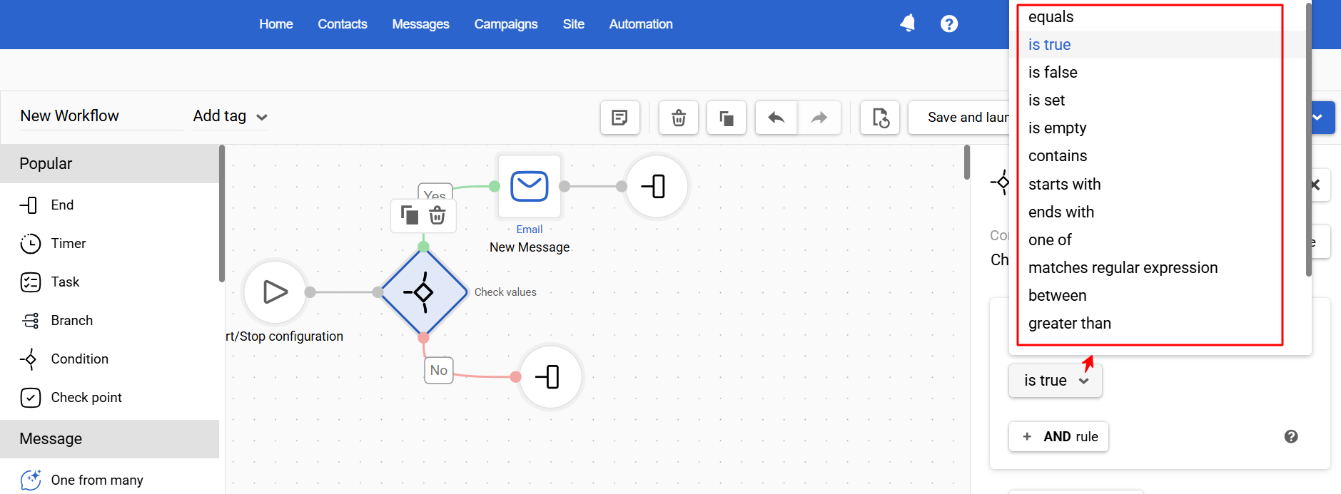 By default, the system checks whether the contact is confirmed by email. Specify the name of the variable or the email address in the Email field. For example, ${emailAddress} or [email protected]