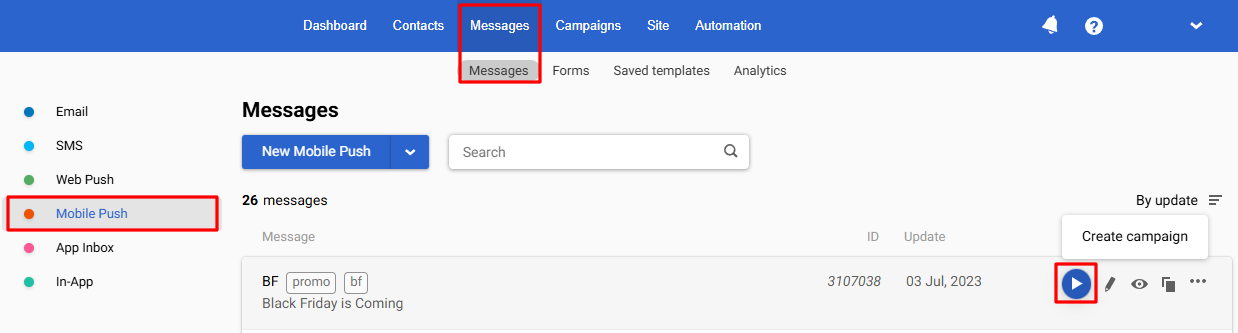 If you want to send a previously saved notification, click on the Create campaign button in the message list on the Messages → Messages → Mobile push tab.