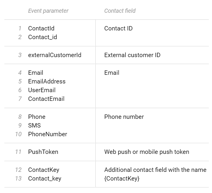Event parameter | Contact field |
