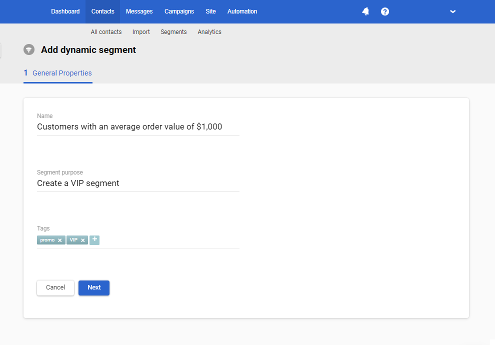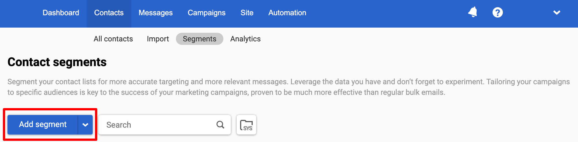 - Go to Contacts → Segments. Click the Add segment button.