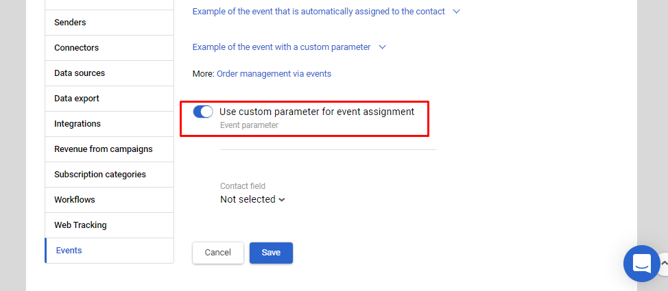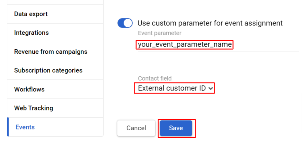 - Activate Use custom parameter for event assignment switcher, select the contact field, and enter the event parameter name.