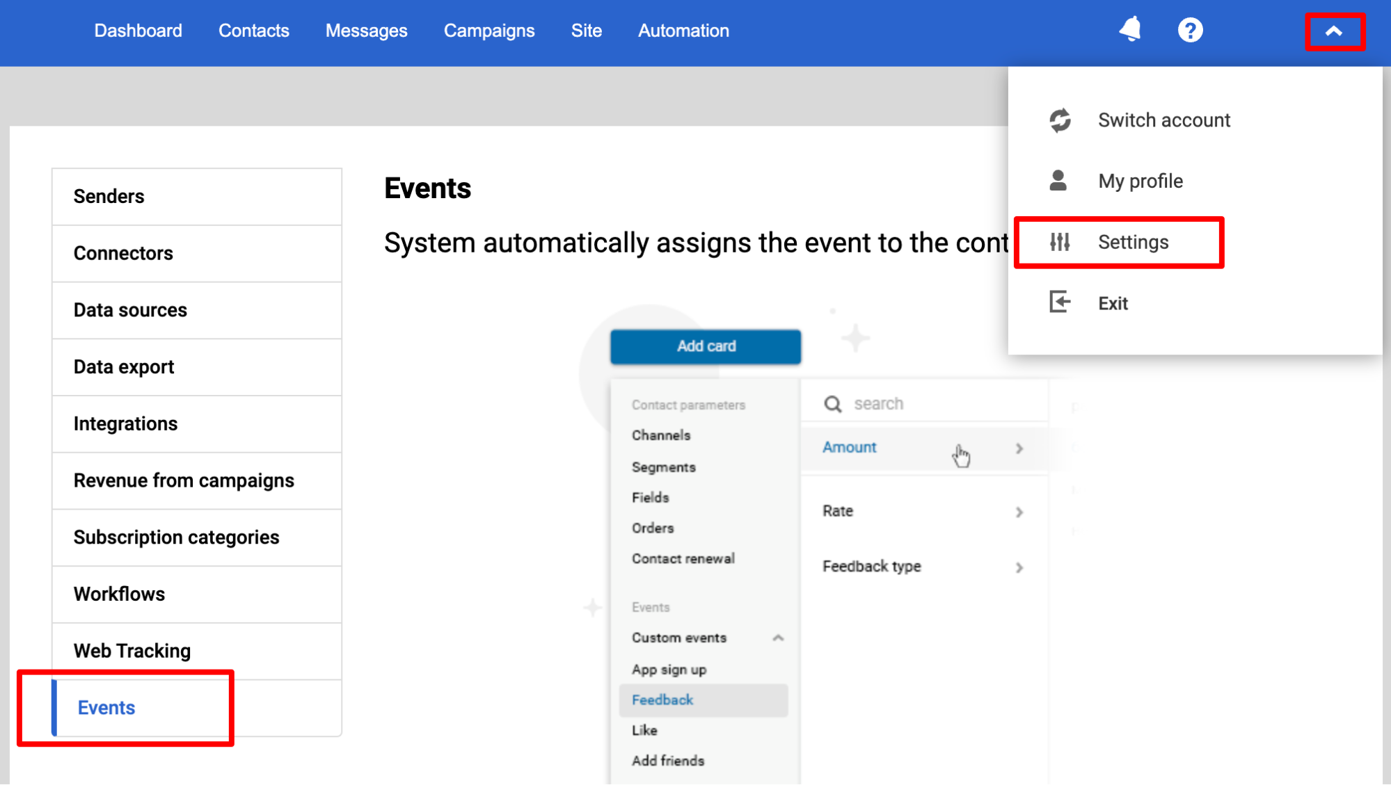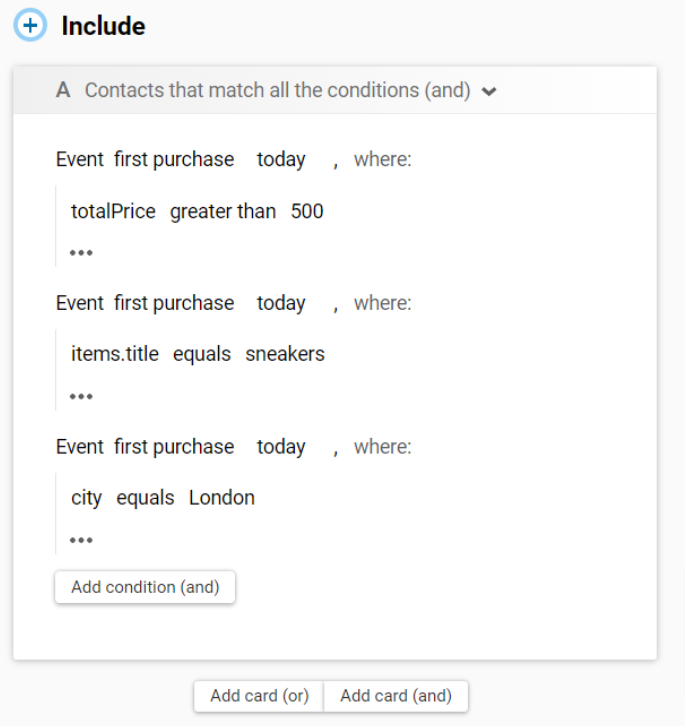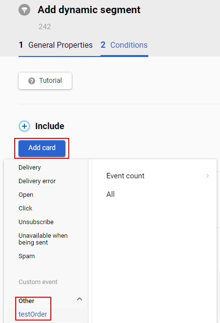 Set up segmentation by events so that custom events and their parameters are recorded in contact cards and can be used to create dynamic segments.