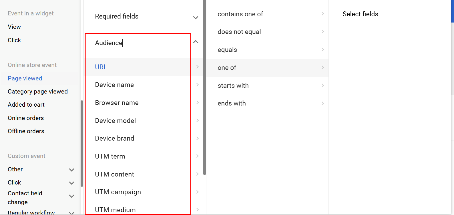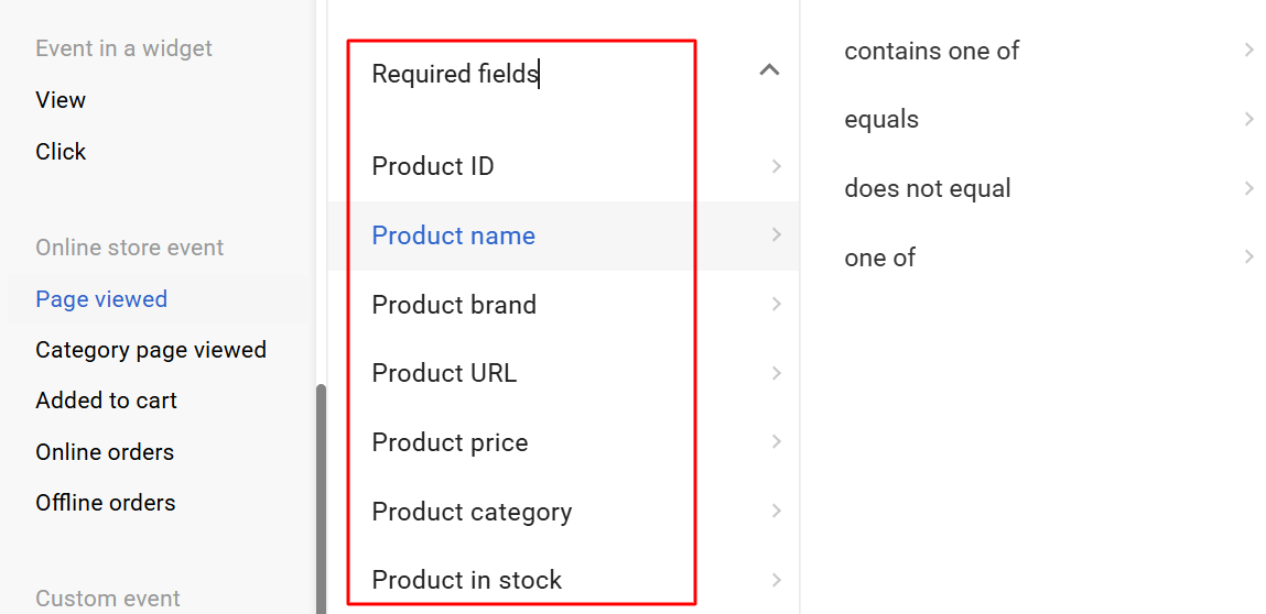 - Product name, product brand, product URL, product category (contains, equals, does not equal, one of, one of);