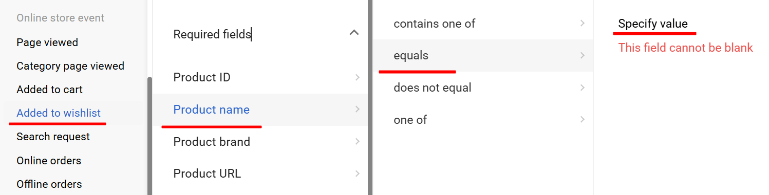 - In the Added to wishlist parameter → required Name field, specify: Equals → Beginner’s Yoga.