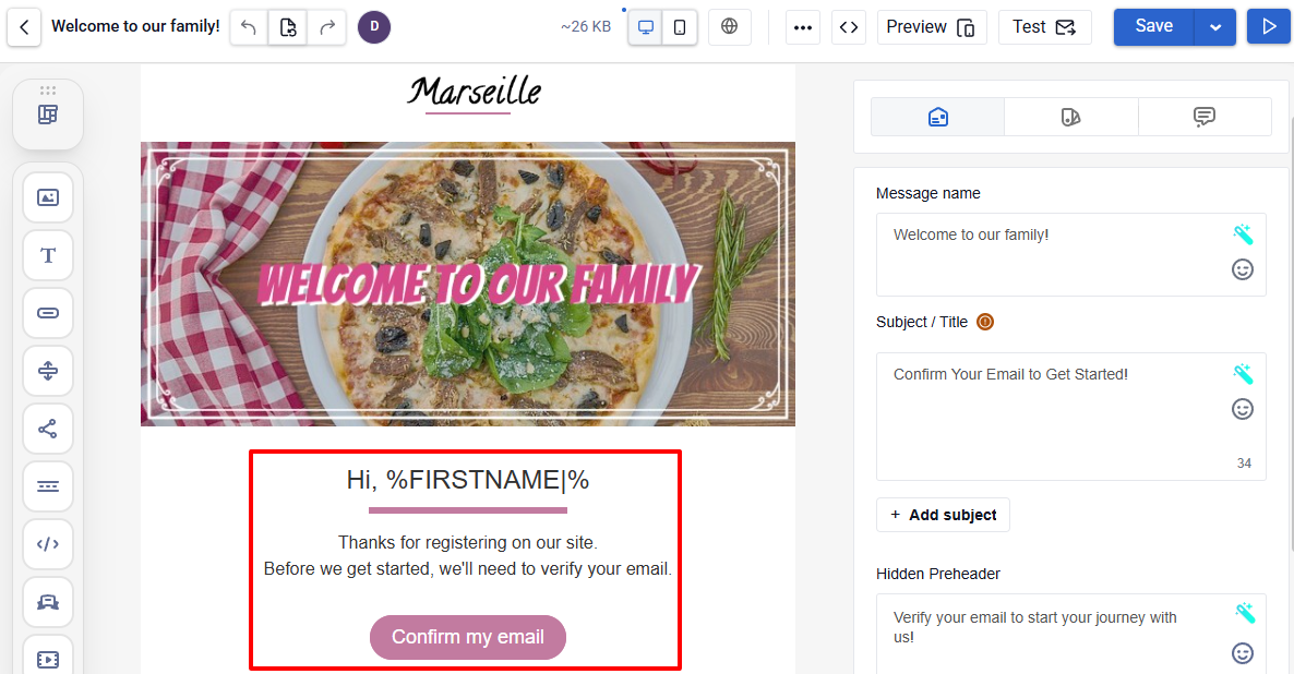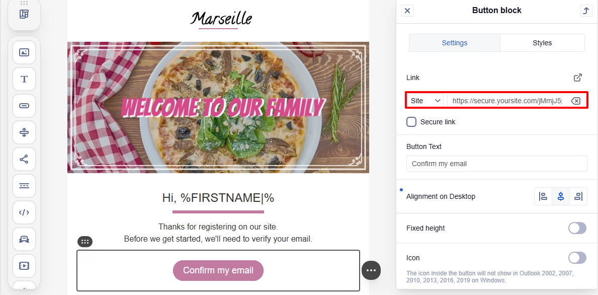 Select a block with a button in the email. In the left panel, in the corresponding field, select the pre-prepared event Confirmed subscription: