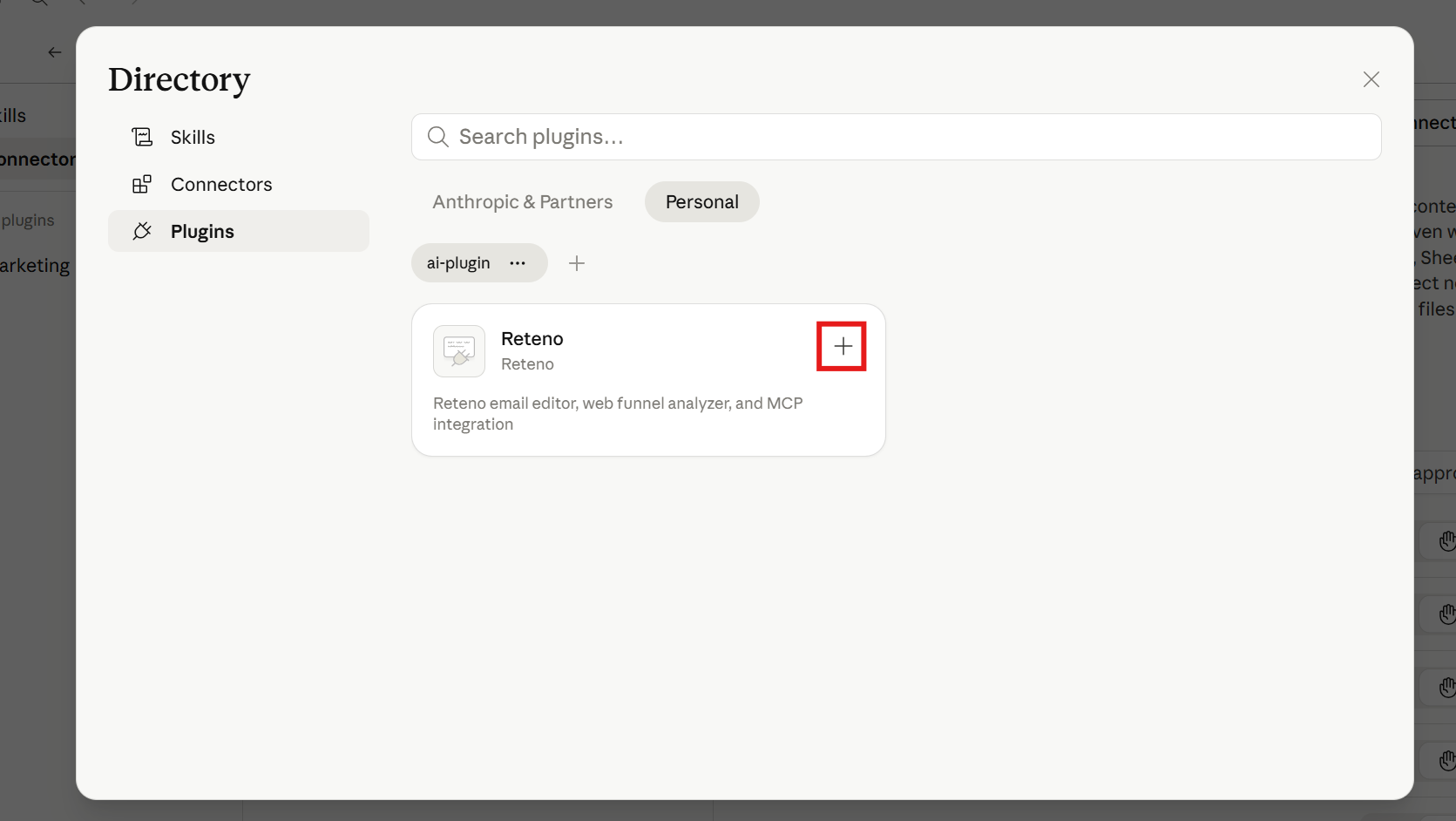 - In the Personal, find the Reteno plugin and click +. You'll see a confirmation: