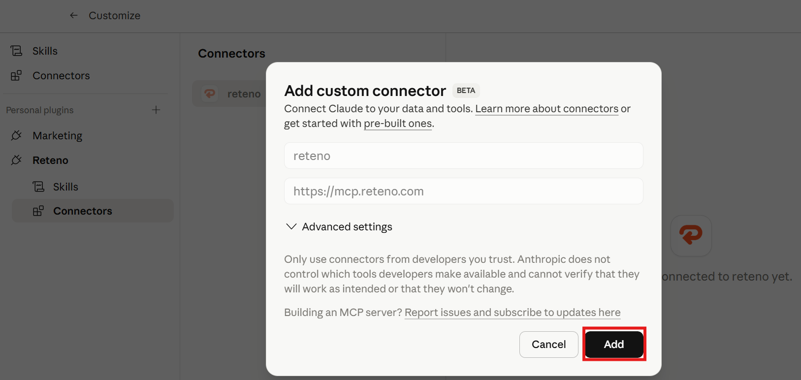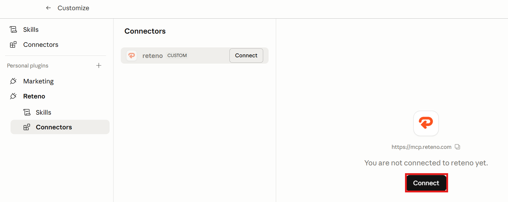 Installing the plugin alone doesn't give Claude access to your Reteno data. You also need to create a connector ā this is what establishes the actual MCP connection between Claude and your Reteno account. Once the connector is set up and you sign in, Claude will be able to see and use your Reteno API tools.