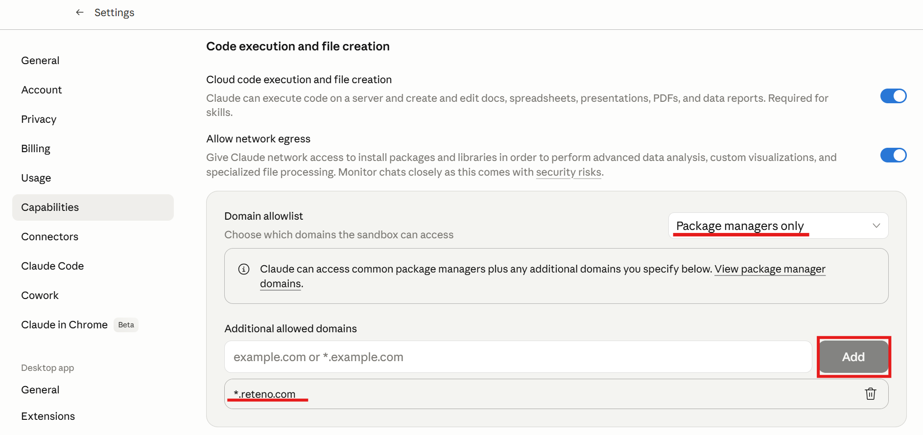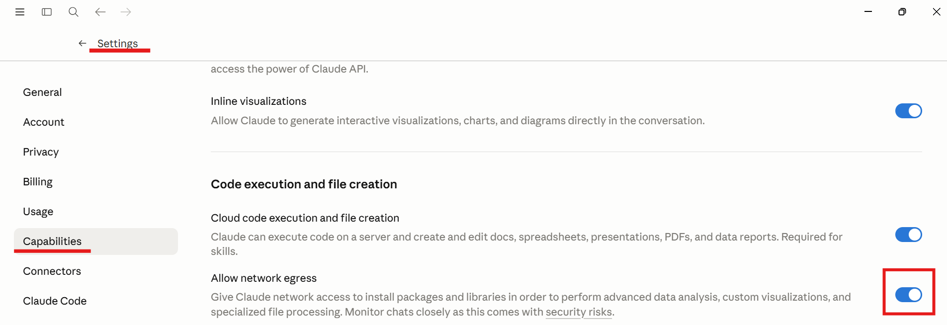 - After installing, click your profile icon in the bottom-left corner, then go to Settings ā Capabilities. Find Cloud code execution and file creation and allow network egress ā it is off by default.