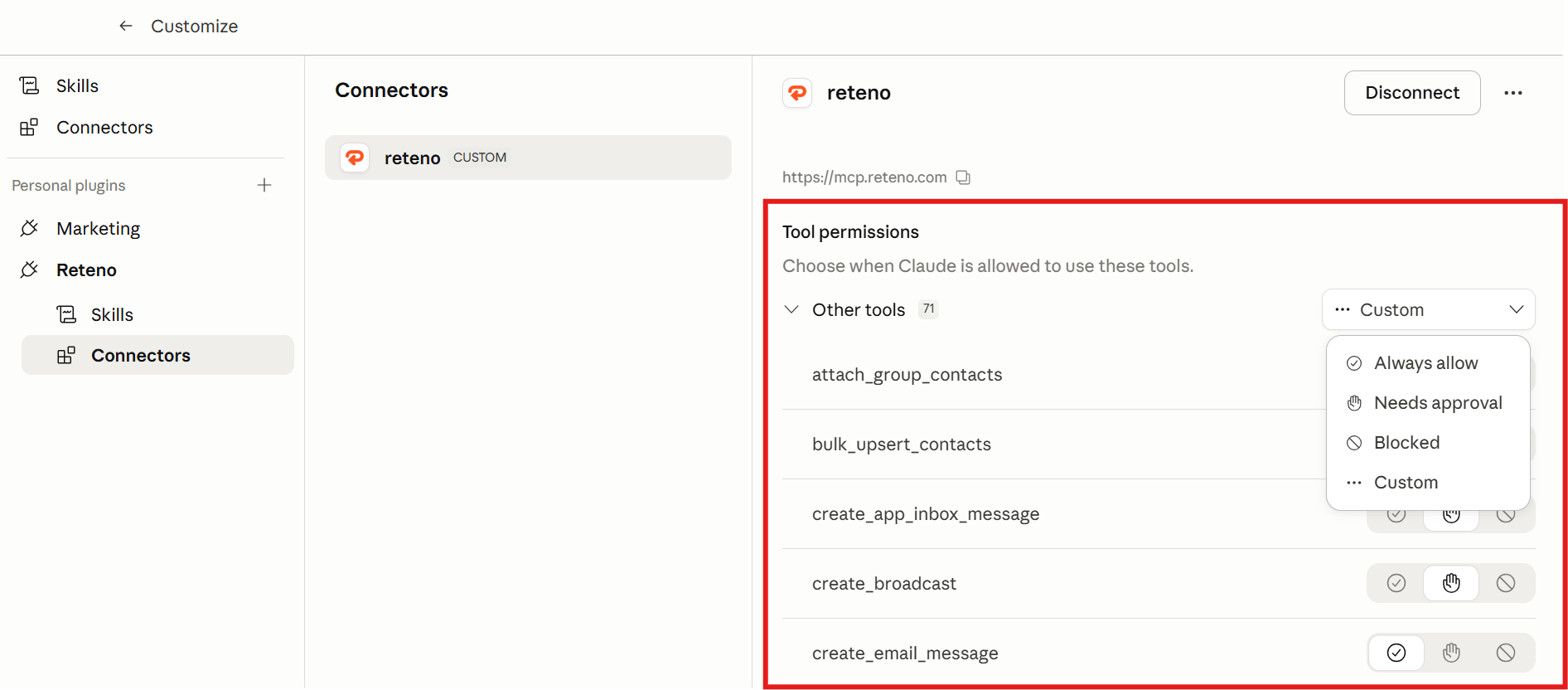After connecting, you'll see a list of Reteno API tools. By default, the agent asks for confirmation before using each tool. If you prefer to skip these permissions, set individual tools to Always allow.