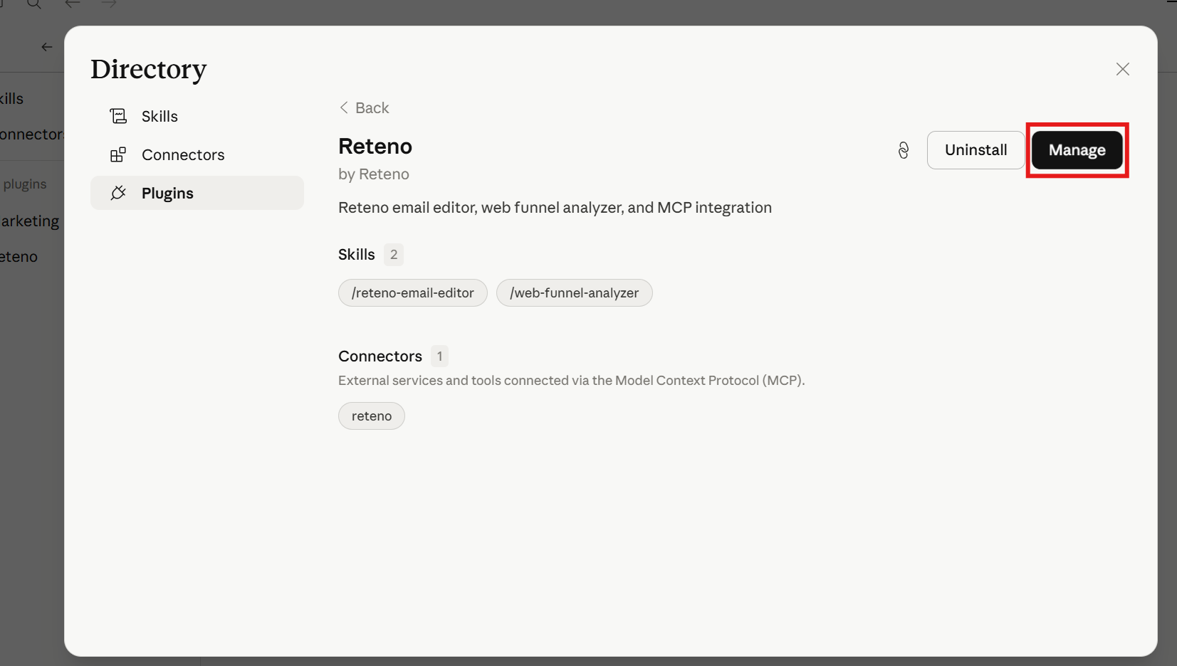 - Click on the Reteno plugin card, then click Manage ā this opens the plugin settings page with Skills and Connectors. Without this step, the Reteno connector won't appear and Claude won't be able to access your account.