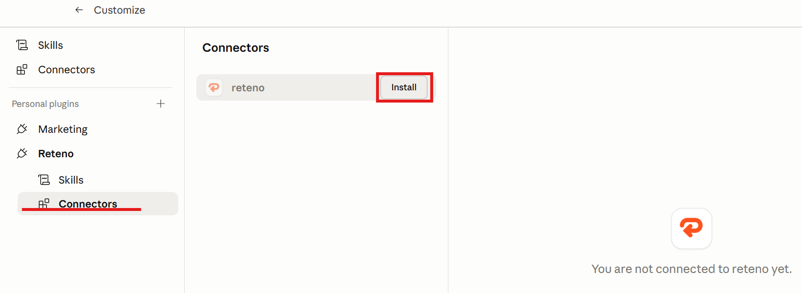 - Go to Reteno ā Connectors and click Install ā this sets up the MCP connector that will link Claude to Reteno.