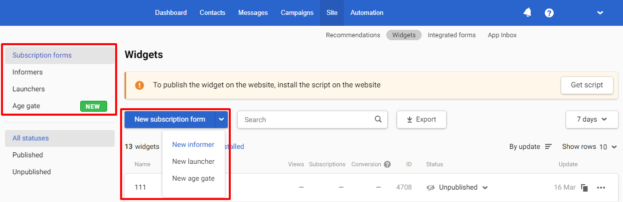 bodytag on every website page. To get a script, go to Site → Widgets, click the Get script button, and specify your site's domain.