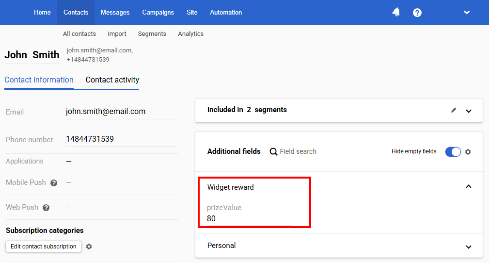 When a user enters data into the fields and subscribes using the widget, a new contact is created, or an existing contact is updated.