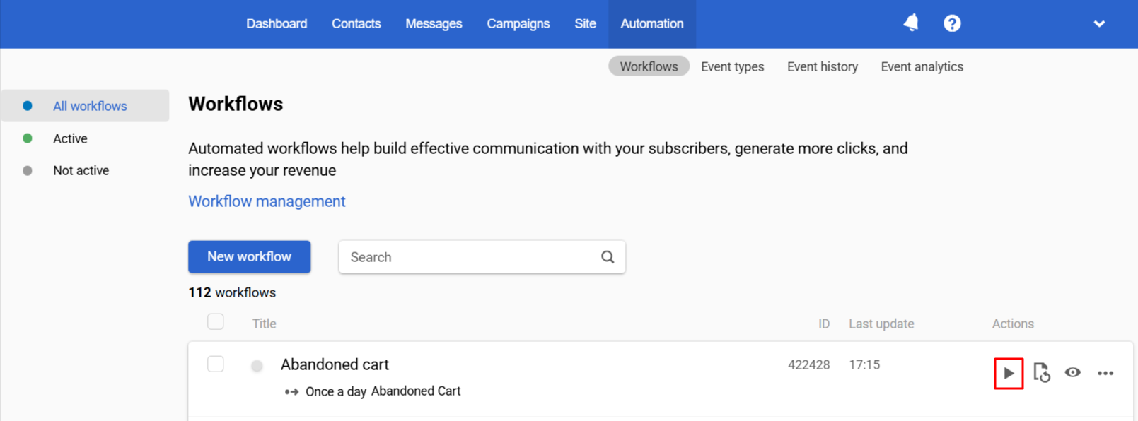 - Go to Triggers → Workflows and click Start/Stop configuration in the field of the created workflow.