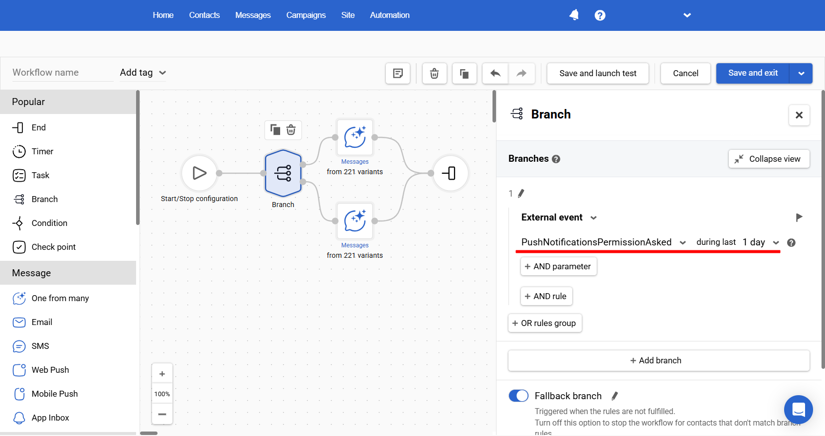 NoteThe Fallback branch is evaluated after all other branches. It captures contacts that don’t match any prior rules. If you disable Fallback, contacts that don’t match any branch will stop at this point in the workflow.