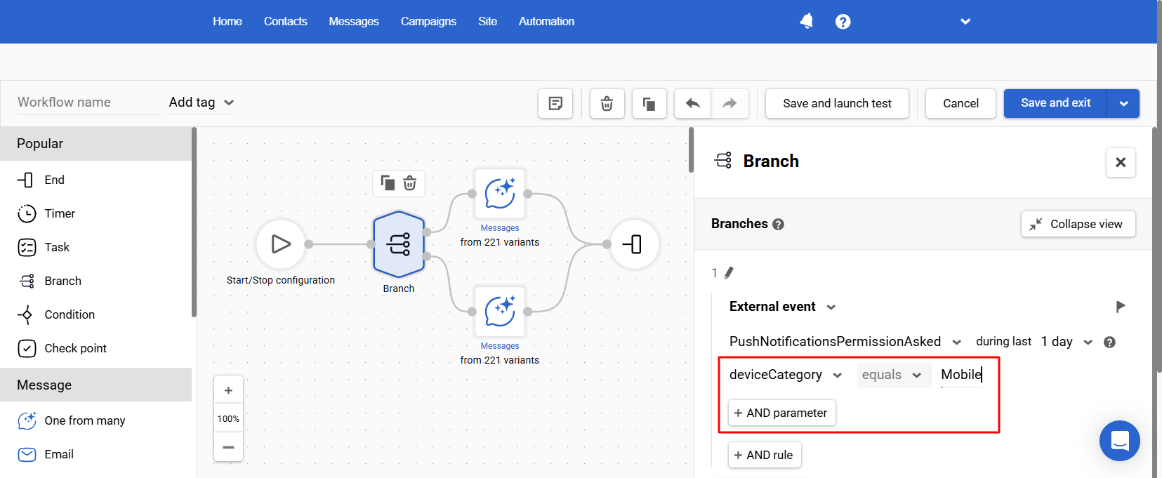 The Branch is a workflow block for defining multiple alternative paths in one place. Instead of chaining many separate Condition blocks (hard to read and maintain), you add branches inside a single block and set rules for each. The system evaluates branches top → bottom and sends the contact down the first branch whose rules are met. This keeps complex logic clear, compact, and easy to maintain.
