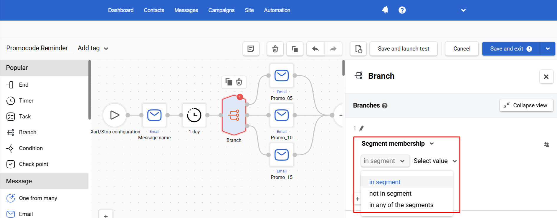Select the condition In segment / Not in segment / In any of segments and specify the segment(s).