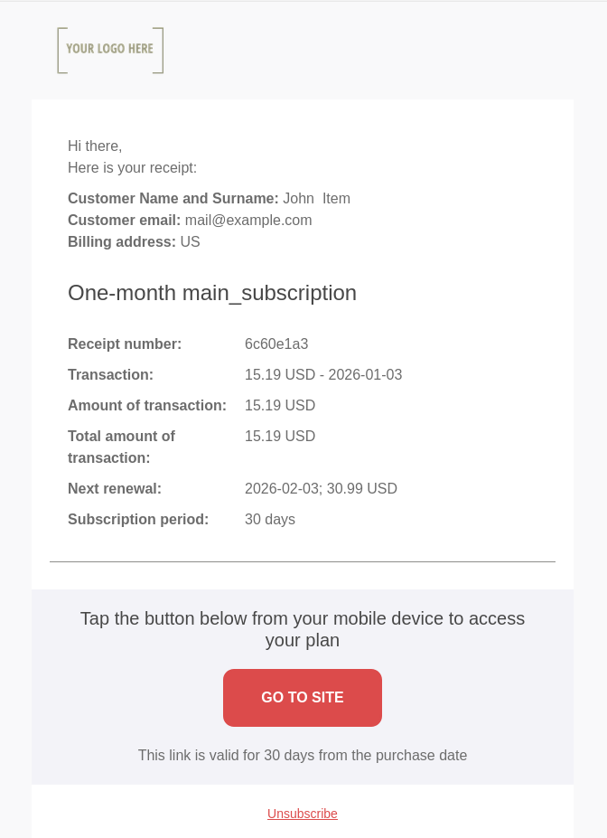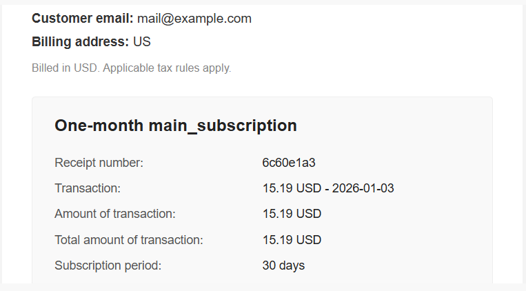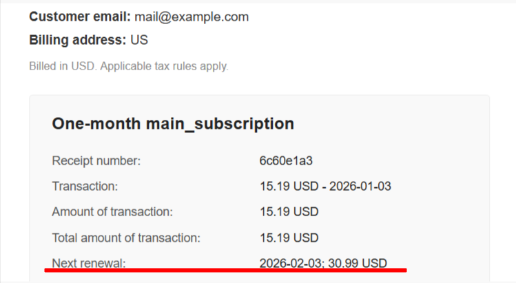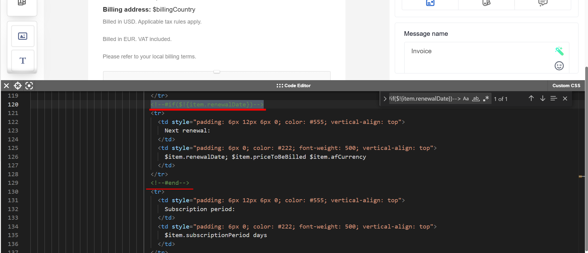 $!{item.renewalDate}— silent if missing${item.product|'Subscription'}— fallback value