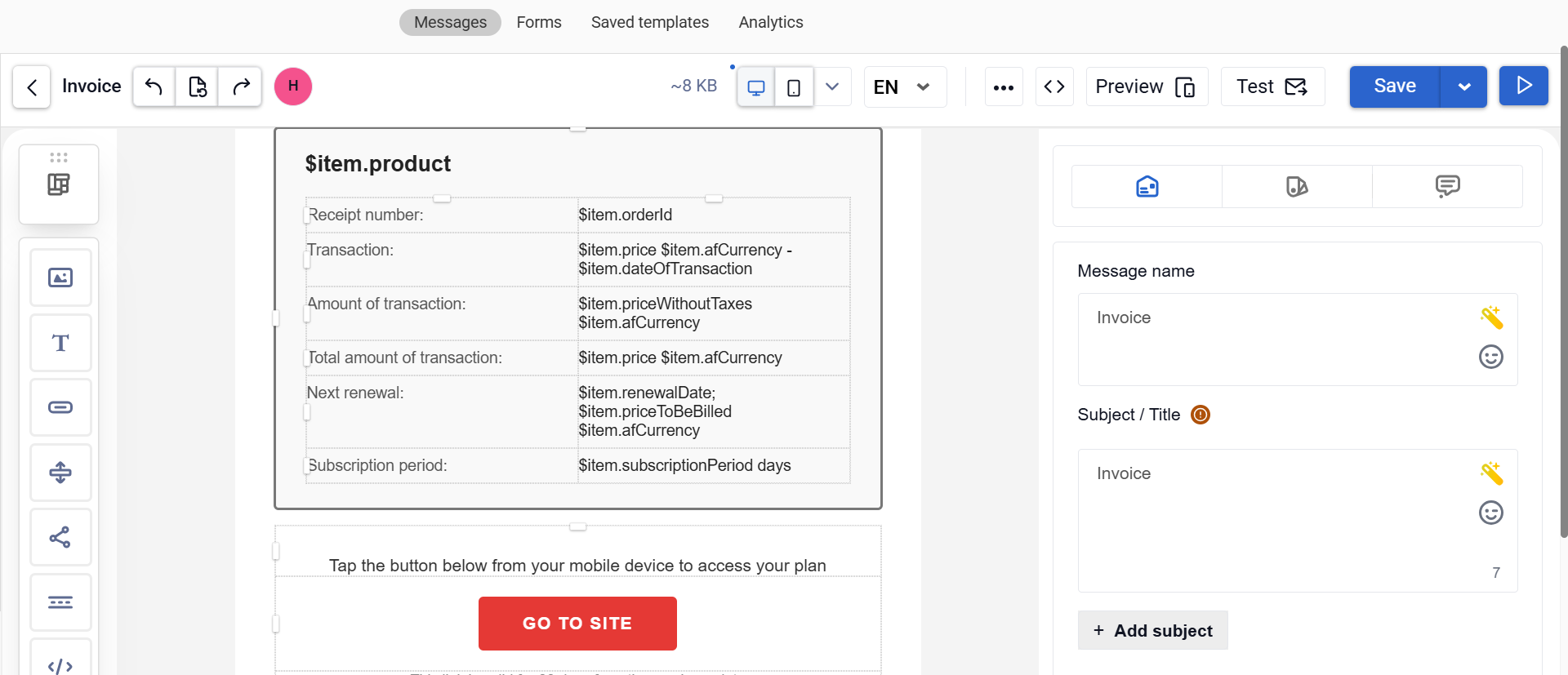Before sending, use Additional settings → Configuring dynamic content in the message editor to preview the result with real data. Paste a JSON object with the parameters you want to test and click View message.