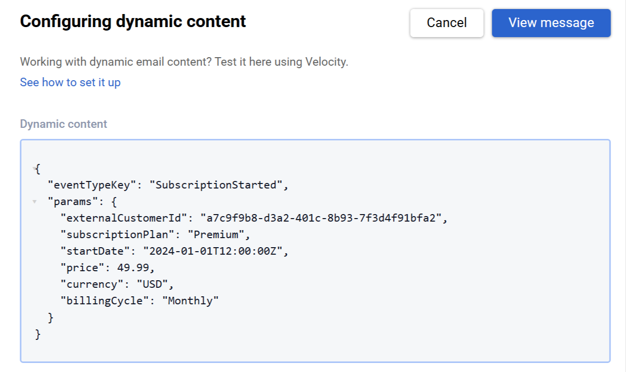 - Use Velocity to add dynamic variables to blocks where personal contact data should be substituted. The number of variables and their names will depend on the message's content.
